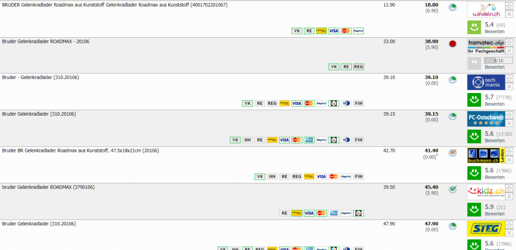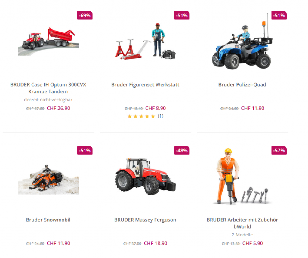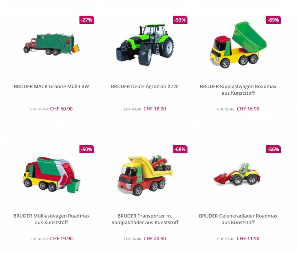 Bei windeln.ch gibt’s gerade diverse Spielfahrzeuge von Bruder zum Bestpreis. Die Preise sind wirklich sehr gut, es lohnt sich aber auch, mehrere Fahrzeuge gleichzeitig zu bestellen, um die Lieferkosten von CHF 6.90 zu verteilen.