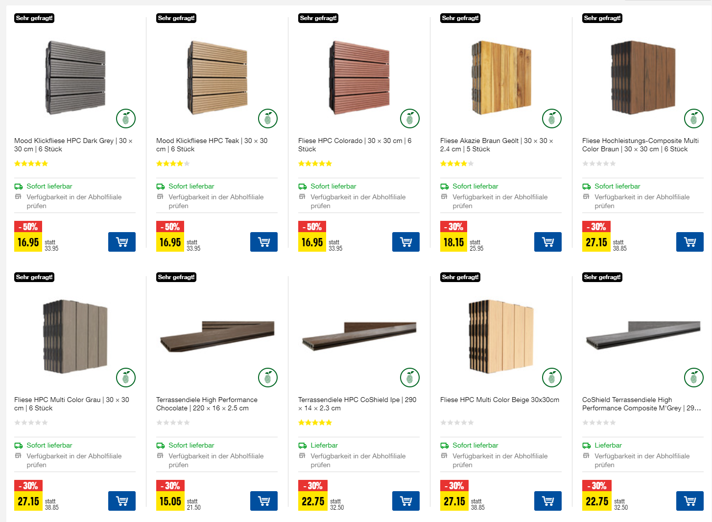 Bei Jumbo sind wieder einige Klickfliessen im Preis reduziert. So erhaltet ihr bis zu 50% Rabatt auf HPC Klickfliessen (z.B. Dark Grey, Teak und Colorado). Auch geölte Akazien Holzfliessen sind reduziert, dort gibt’s allerdings “nur” 30% Rabatt. Wenn ihr dem Deallink folgt, findet ihr alle Varianten. Bei Mömax findet ihr aktuell ebenfalls eine Aktion auf Fliesen, auf 6 Stück hochgerechnet zahlt ihr allerdings rund 7 Franken mehr.