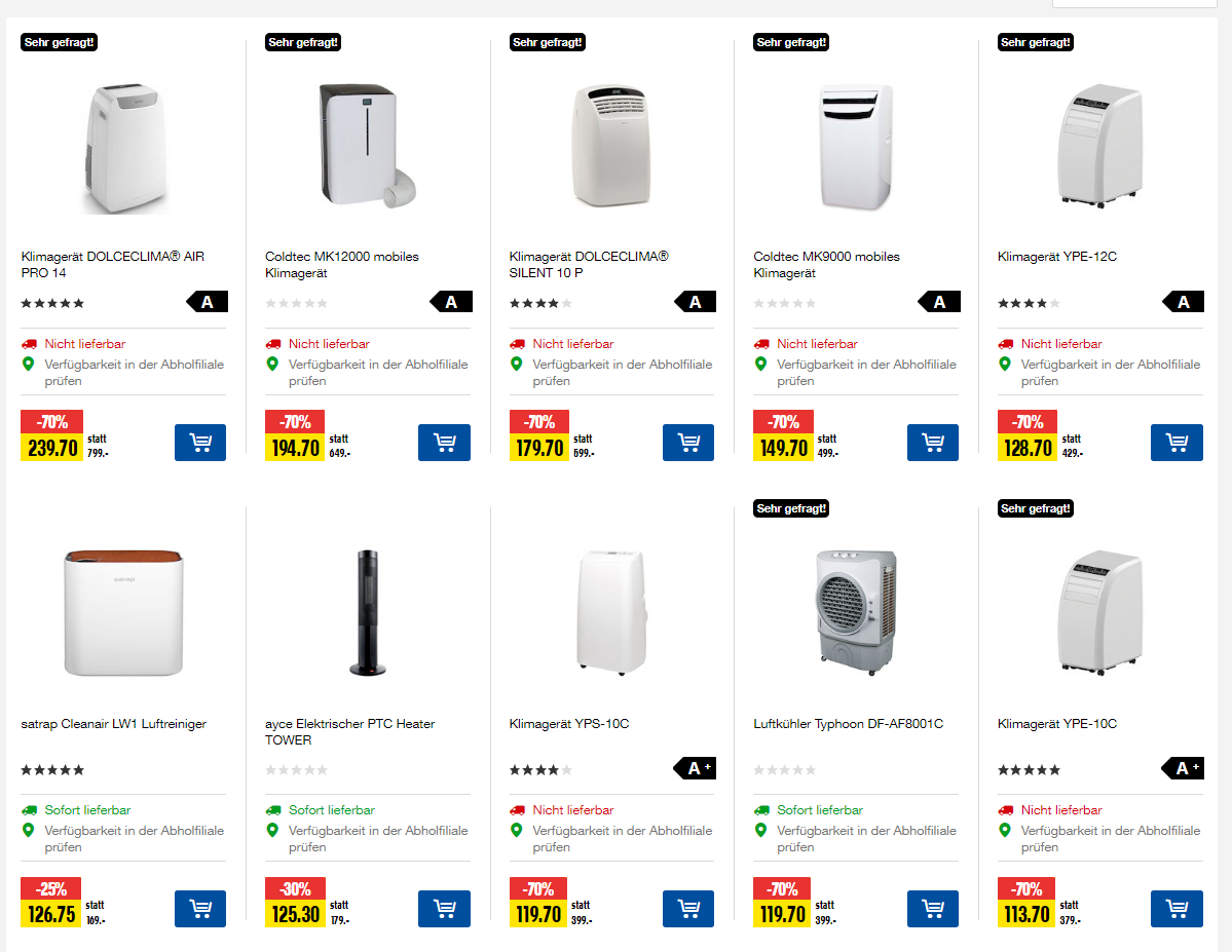 Update - 2022.10.04In einigen Filialen sind weiterhin viele Klimageräte abholbar! Sichert euch die Abkühlung für den nächsten Hitzesommer 😉