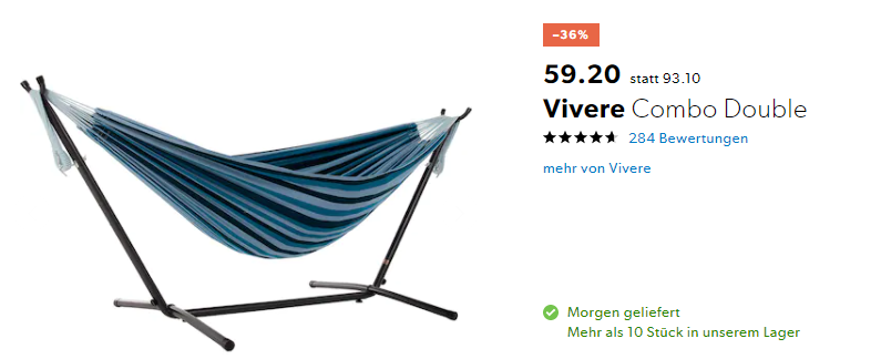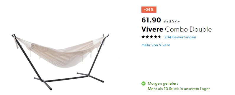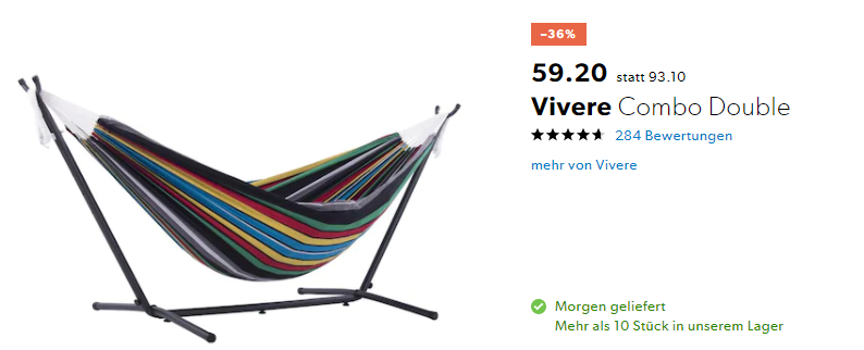 Bei Galaxus gibts derzeit diverse Modelle der Doppelhängematratze Vivere Combo Double zum Aktionspreis ab CHF 59.20. Laut Google Shopping verlangt z.B. Hornbach 138 Franken.