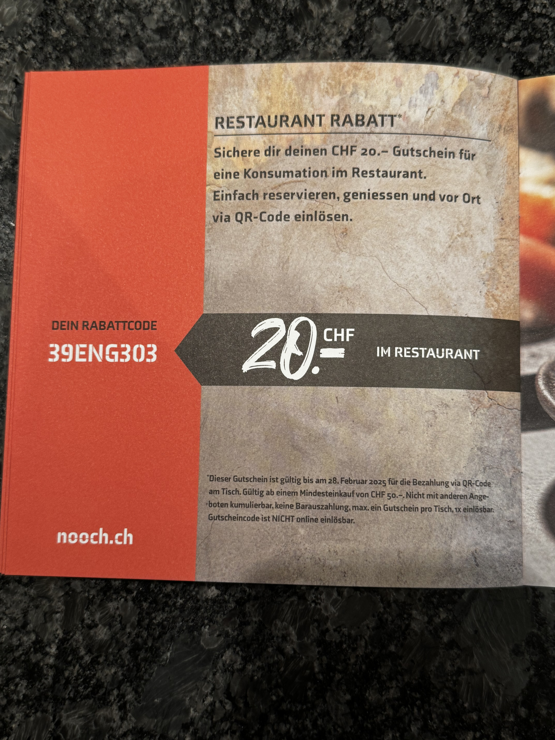 CHF 20.- Restaurant Rabatt bei einer Bestellung ab CHF 50.-