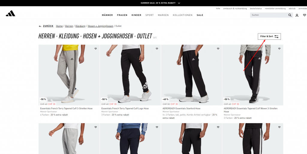 Leider sind bei vielen Trainerhosen nur noch wenige Grössen verfügbar. Deshalb oben rechts auf der Website auf den Knopf „Filter & Sort“ klicken und dann die richtige Grösse auswählen: