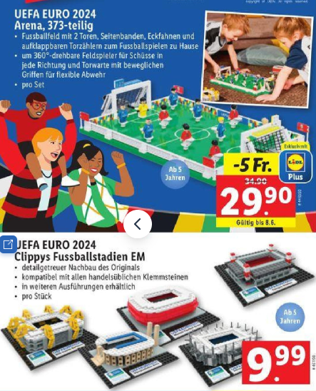 Ihr wollt euch schon einmal auf die EM einstimmen und euch auch passend einkleiden? Dann ab zum LIDL! Hier gibt’s aktuell diverse Merchandise Artikel für die Schweizer Nati wie z.B. Trikots im Schweizer Look, Shorts oder auch Spielzeug. Für Kinder gibt’s auch ein sehr preisstarkes Set für nur 6.99 Franken!