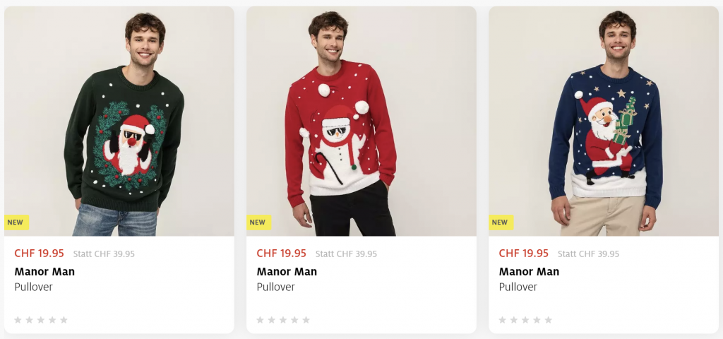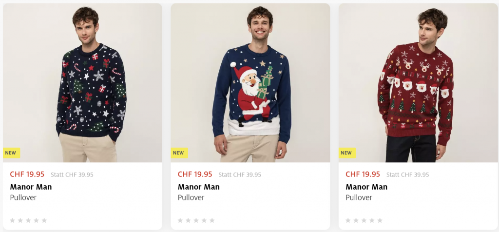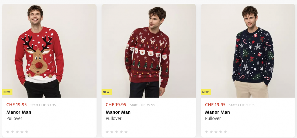 Bei Manor gibt’s im SALE gerade eine grosse Anzahl Ugly Christmas Pullis für CHF 19.95 So kann man sich schon einmal für die nächsten Jahre eindecken, statt dann für knapp 50 Franken drei Tage vor Weihnachten die Läden zu stürmen.