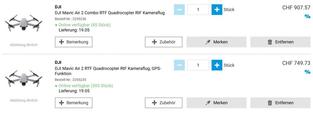 So bekommt man die neue DJI Mavir Air 2 für knapp CHF 807.- und das Combo-Package für CHF 977.- (Aktuelle Toppreise: CHF 824.- resp. CHF 1’030.90).