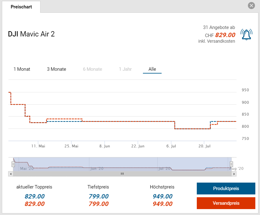 Bei Amazon gibts derzeit die Drohne Mavic Air 2 von DJI zum neuen Bestpreis von 733 Franken zu erwerben, laut toppreise soll es sie nie günstiger als für 799 Franken gegeben haben.