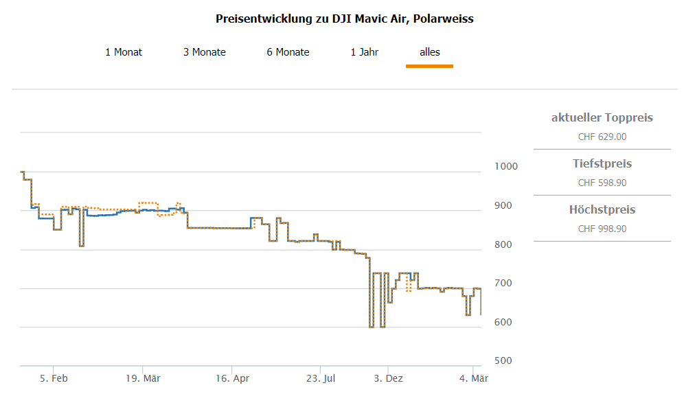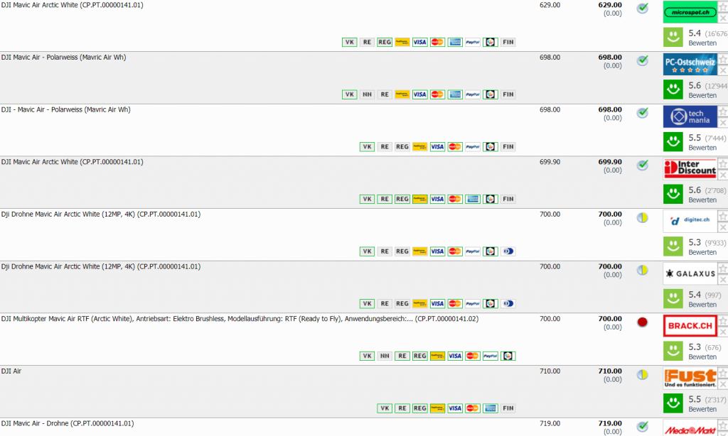 Bei microspot gibt’s 25 Stück DJI Mavic Air Arctic White für CHF 629.- Zweitbester Preis beträgt CHF 698.- Bestpreis laut toppreise war bei CHF 598.-