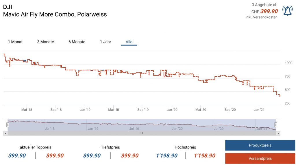 Bei interdiscount bekommt ihr aktuell die DJI Mavic Air Fly More Combo in Polarweiss für 399.90 CHF. Zweitbester Preis gemäss toppreise sind 429.- CHF.