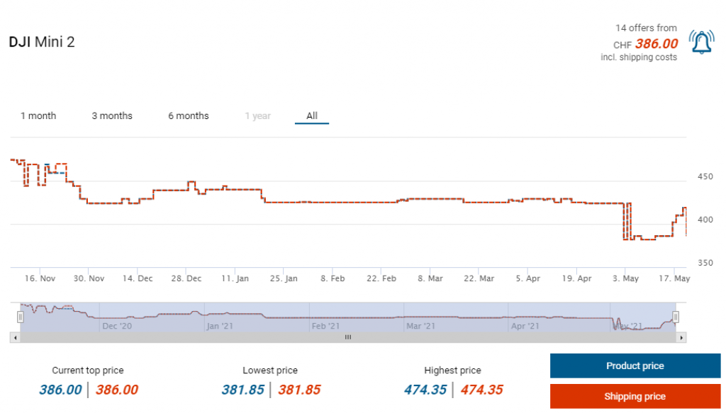 Bei Mediamarkt gibts derzeit die kleine Drohne DJI Mini 2 zum Aktionspreis von 386 Franken. Laut toppreise liegt der Vergleichspreis sonst bei 419 Franken. Laut Preispirat-Recherche lag der Bestpreis aber auch schon mal bei knapp 333 Franken in diesem Deal hier.