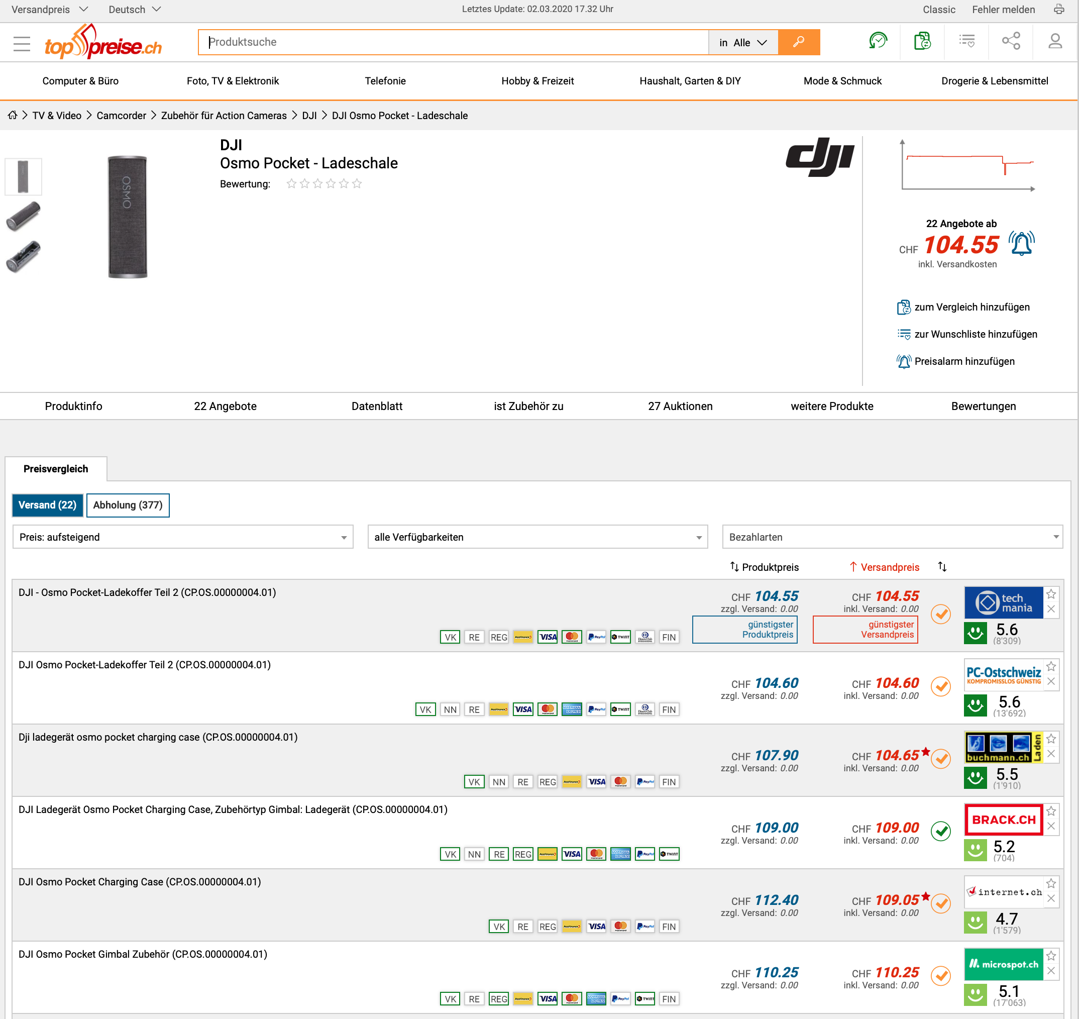 Bei Melectronics gibt’s gerade das Spiel Dji Osmo Pocket Charging Case Kit für CHF 259.- (mit Newsletter) Zweitbester Preis beträgt (insgesammt) CHF 399.55.-
