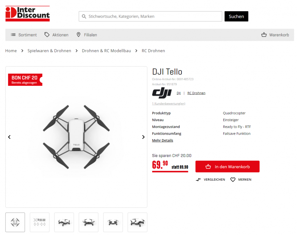 Bei Interdiscount erhält man die DJI Tello für 69.90CHF beim COOP Bruder zwar auch.