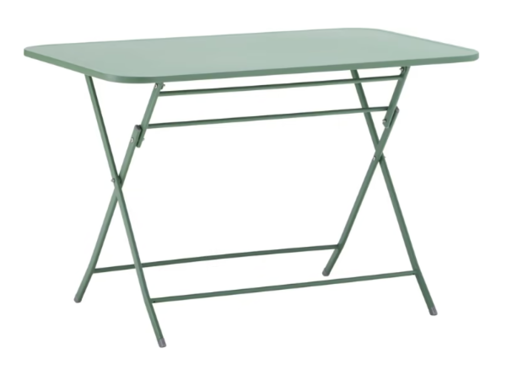 Die Tischoberfläche aus pulverbeschichtetem Metall in Grün ist robust, langlebig und verleiht dem Tisch eine moderne Optik. Das Gestell, ebenfalls aus pulverbeschichtetem Metall in Grün, sorgt für eine stabile Basis.