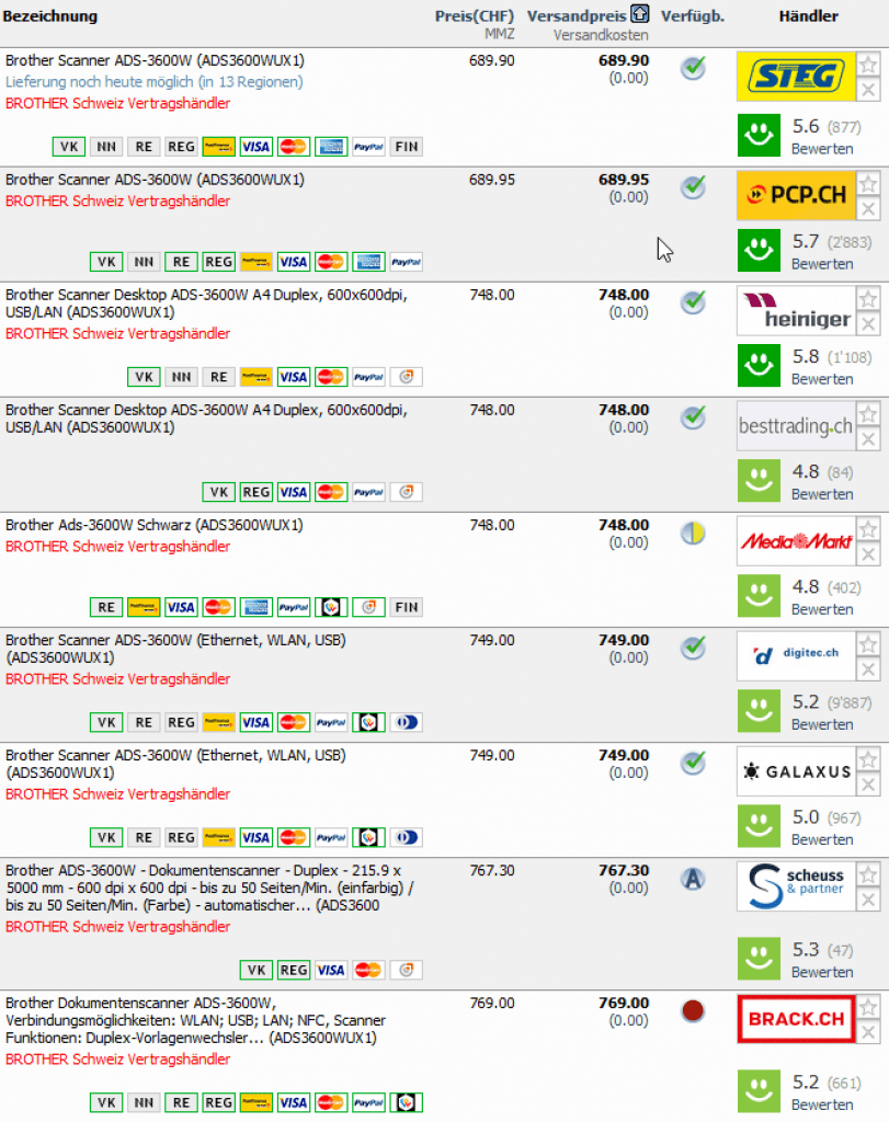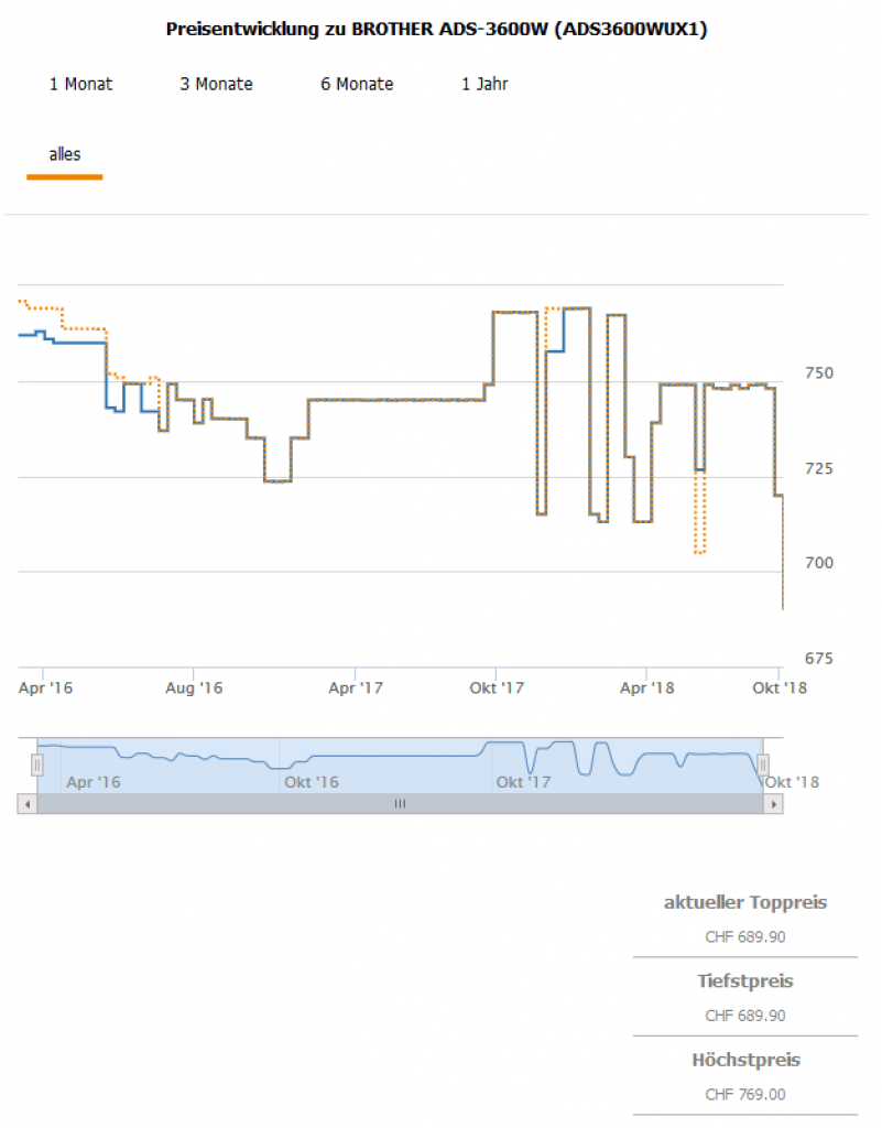 Gemäss toppreise gab es den Scanner bislang nie günstiger als für 704.85 CHF, der zweitbeste Preis liegt bei 748.- CHF.