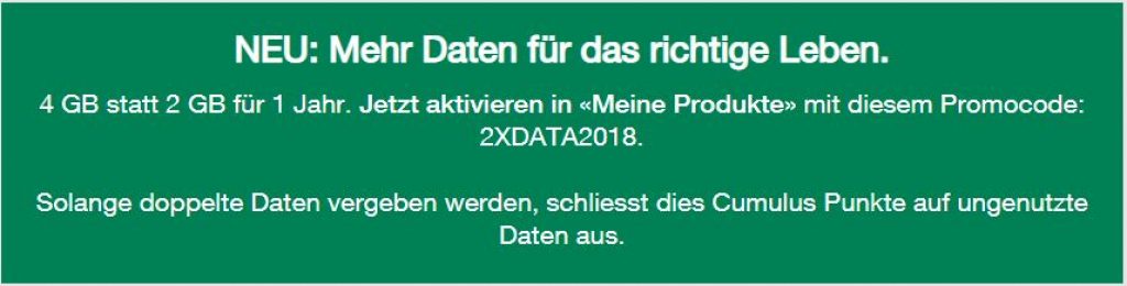 Alternativ könnt ihr am Cumulus Programm teilnehmen. Pro NICHT verbrauchtes MB gibt es ein Cumulus Punkt. Beide Angebote müsst Ihr in eurem Kundenkonto unter MEINE Produkte, dann Promo CODE aktivieren. Beides miteinander geht aber NICHT!