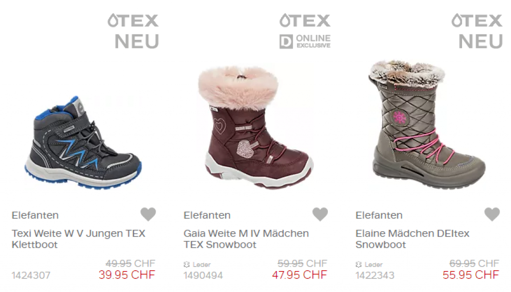Bei Dosenbach gibt’s heute als Sonntags Deal 20% Rabatt auf die ganze Kollektion von „Elefanten“. Elefanten sind die günstigen, aber trotzdem qualitativ hochwertigen Kinderschuhe von Dosenbach bzw. Deichmann. Ein Gutscheincode ist zum Profitieren nicht notwendig, der Rabatt wird schon im Shop angezeigt.
