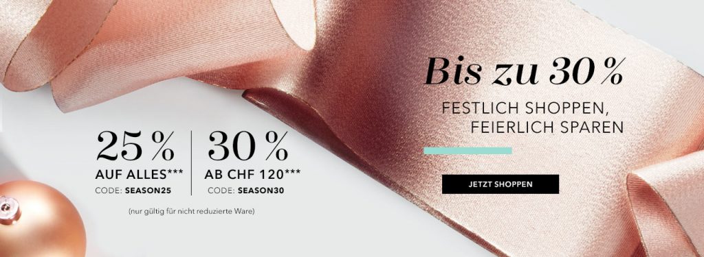 Es gibt mit dem Code SEASON25 25% auf alles bei Douglas. Ab CHF 120.- Einkaufswert erhaltet ihr mit dem Code SEASON30 sogar satte 30% auf alles.