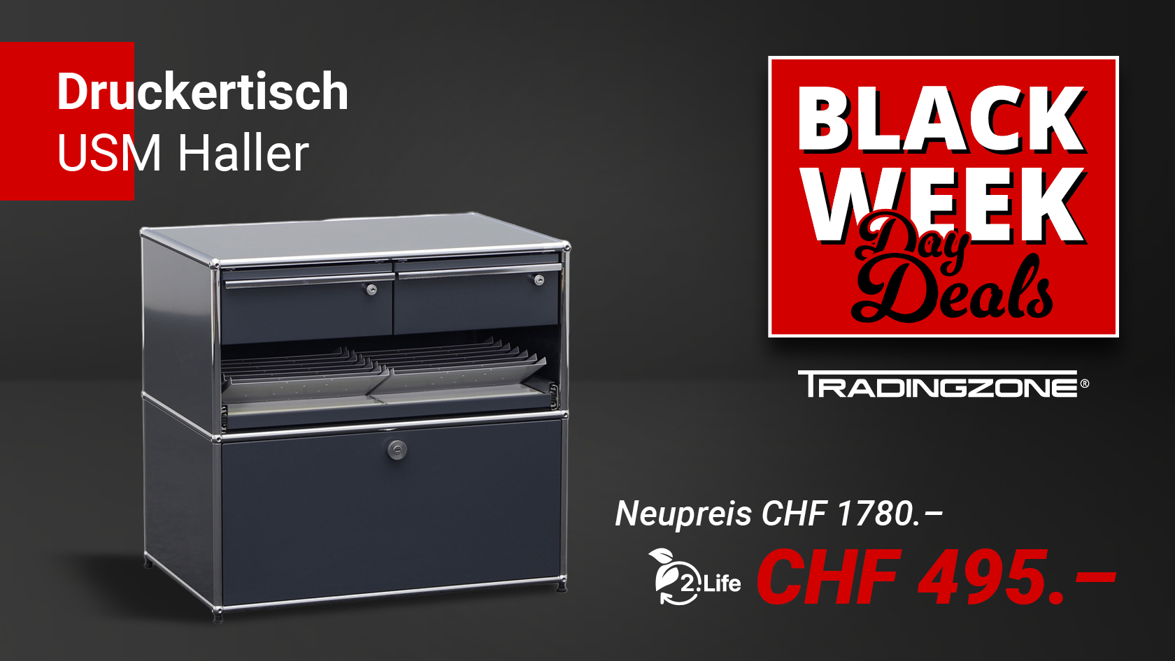 Kompakter Druckertisch mit Schubladen, Hängeregister und Tablar. Hochwertig gefertigt in der Schweiz – jetzt zum Black Week Aktionspreis!