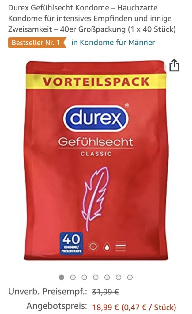 Bei Amazon gerade diverse Durex Produkte in Aktion. Im Vergleich zu den CH-Preisen (Galaxus, Amorana, etc.) teils recht grosse Sparmöglichkeiten. Natürlich immer vorausgestzt, man(n) braucht die Dinger überhaupt… Aktuell wird im Parlament ja diskutiert, auf jede Packung Kondome ein Bild von Alain Berset mit erhobenem Zeigefinger draufzukleben - KEEP YOUR DISTANCE, DUDE…!! 😉