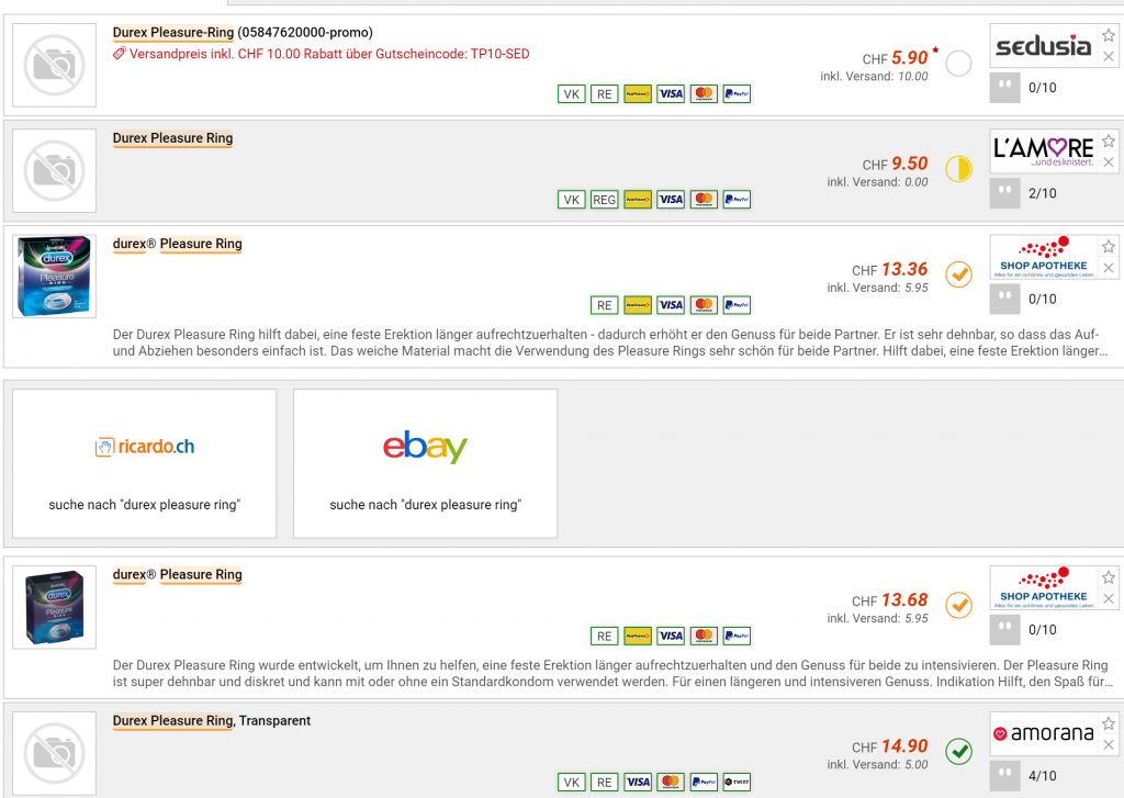 Bei Sedusia gibt’s gerade den Durex Pleasure Ring für CHF 5.90 Den Mindermengenzuschlag kann man mit dem Gutscheincode TP10-SED umgehen. Zweitbester Preis beträgt CHF 9.50