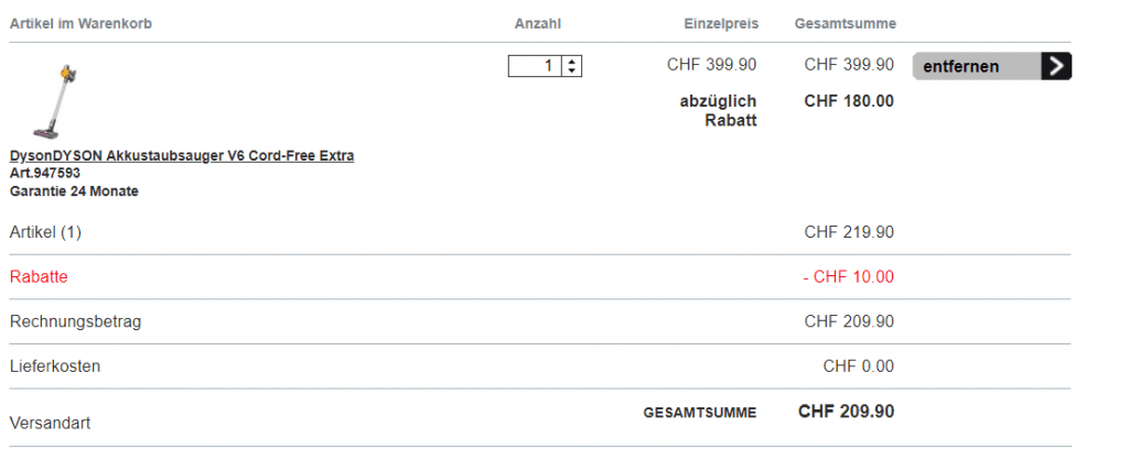 Der Wochenknaller bei Interdiscount ist diese Woche der DYSON Akkustaubsauger V6 Cord-Free Extra für CHF 219.90. Mit dem Gutscheincode „TRADING-2018“ erhält man auf diesen Preis noch einmal 10 Franken Rabatt. Damit ist Interdiscount 90 Franken günstiger als der momentan zweitbeste Preis bei microspot von über 300 Franken. Natürlich geht es auch teurer: bei Brack für CHF 369.- oder melectronics für CHF 399.-