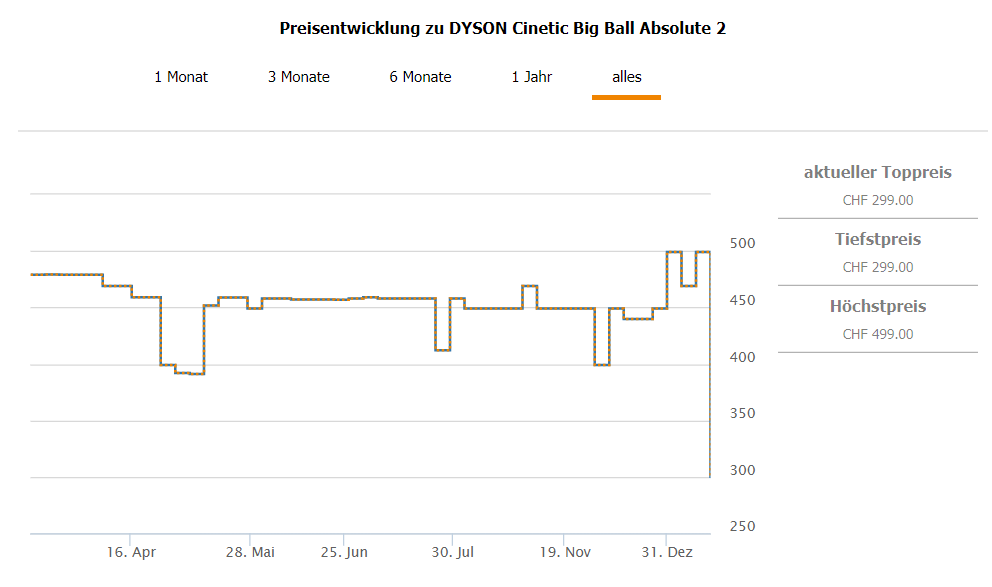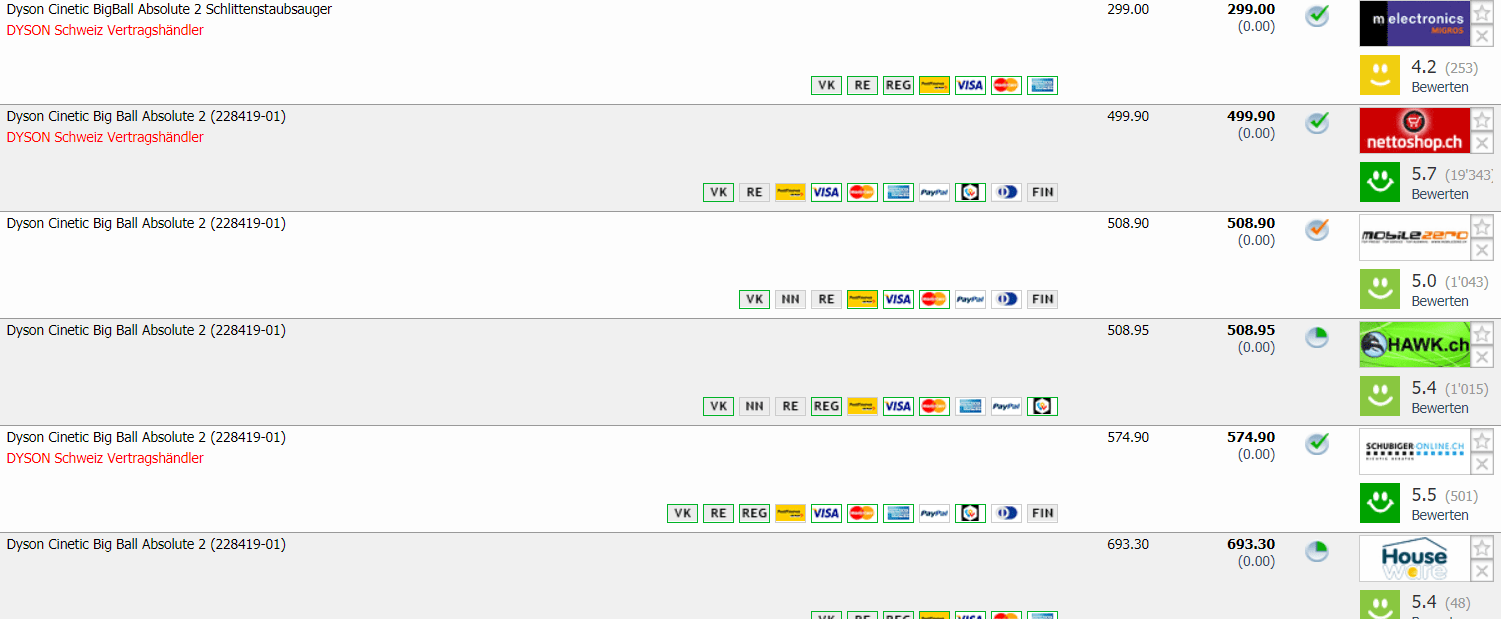 Der Dyson Cinetic BigBall Absolute 2 ist bei Melectronics zum Toppreis von CHF 299.- zu haben. Mit dem Newslettergutschein gibt’s nochmals 10.- Rabatt, was uns zum Endpreis von CHF 289.- bringt. Bisheriger Bestpreis war gemäss Toppreise.ch bisher CHF 391.- Der zweitbeste Preis in der Schweiz beträgt lt. toppreise CHF 499.-