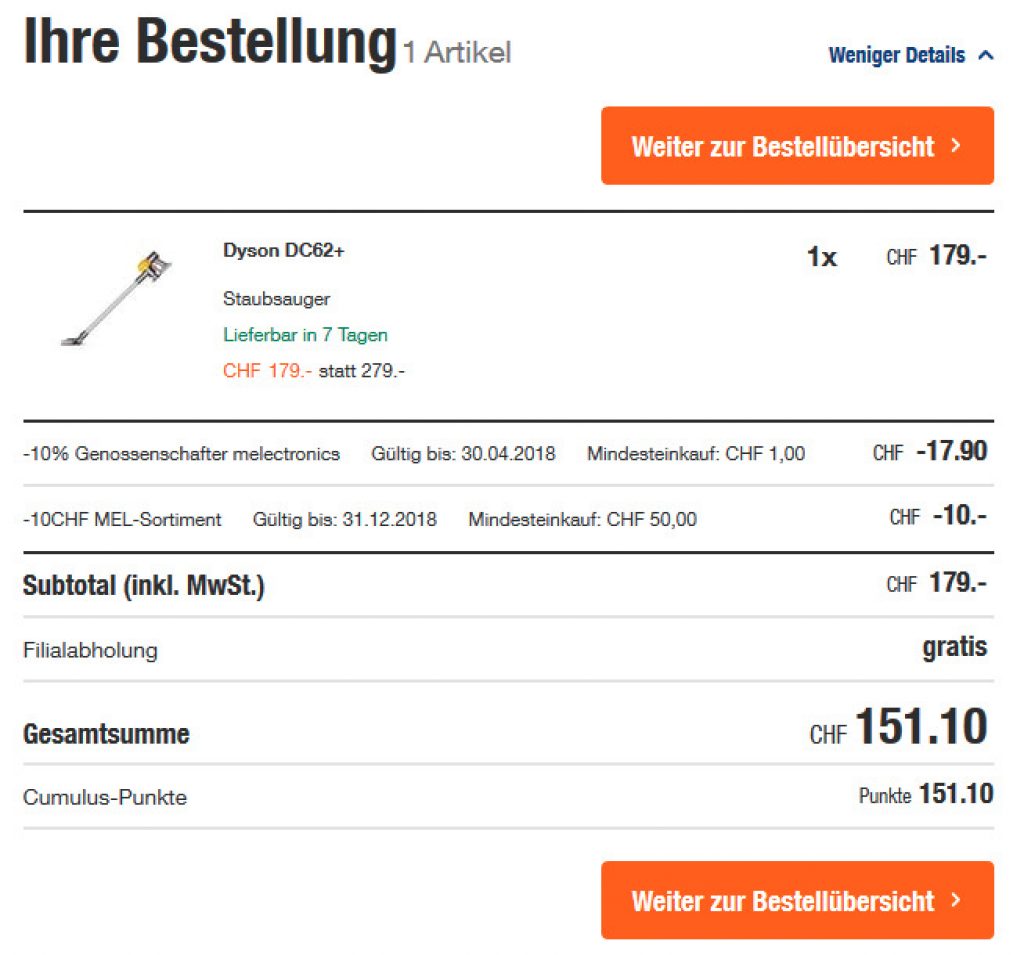 • Zum Deal klicken und den DYSON DC62+ in den Warenkorb legen