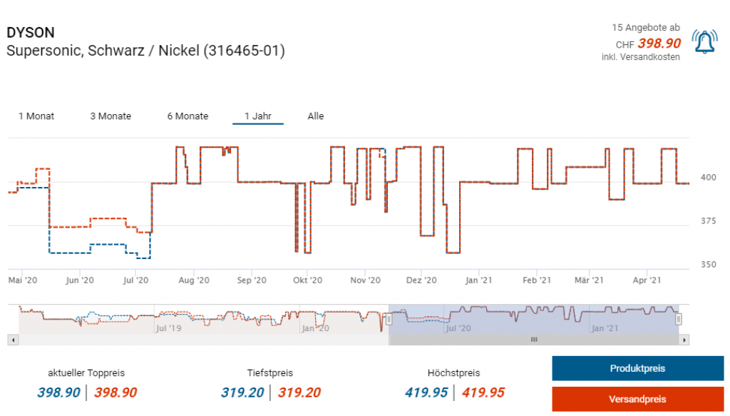 Bei Manor gibts derzeit den Haarfön Dyson Supersonic zum Aktionspreis von CHF 359.20. Laut toppreise startet der Vergleichspreis sonst bei knapp 399 Franken, mit sofortiger Verfügbarkeit aber erst bei 419 Franken.