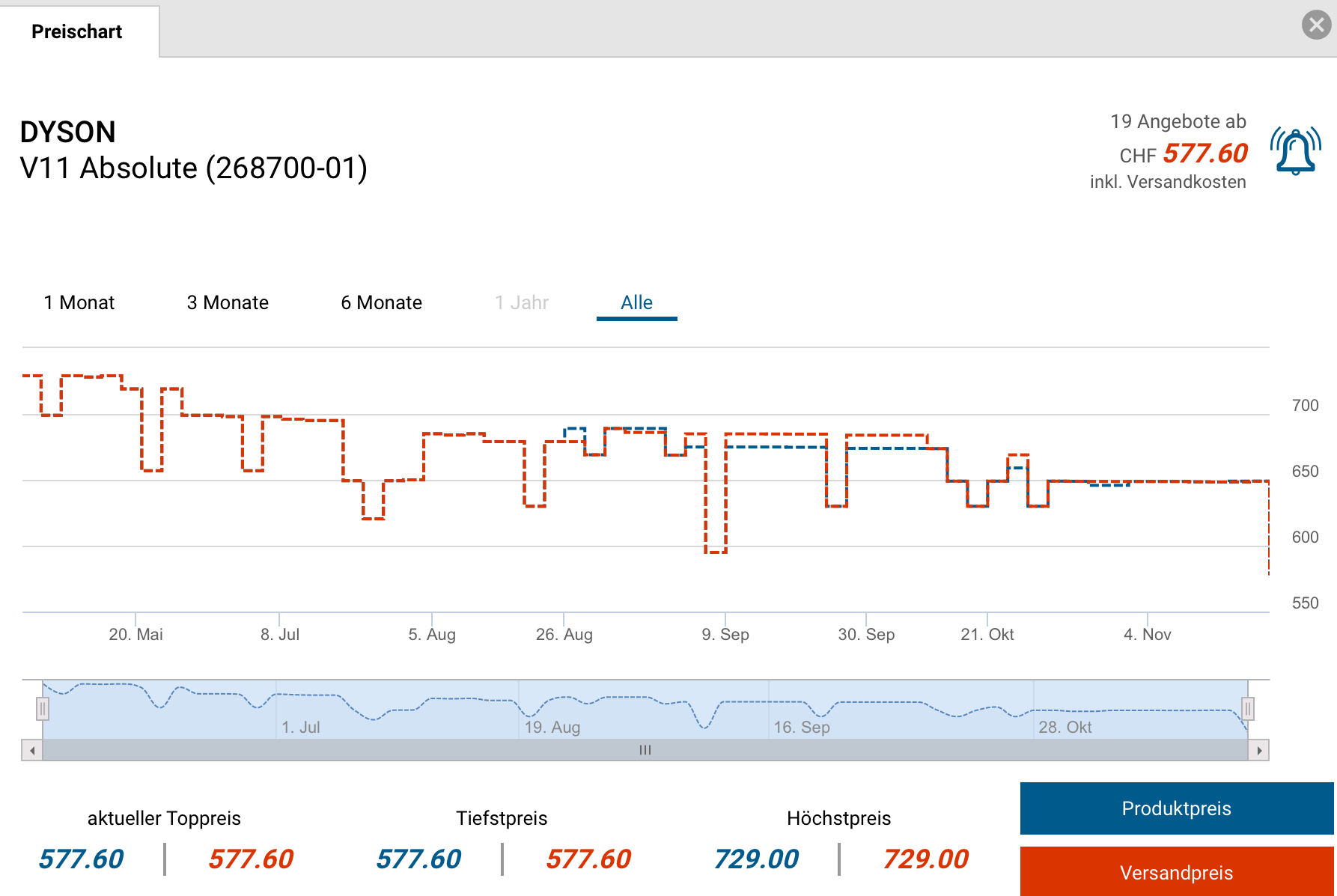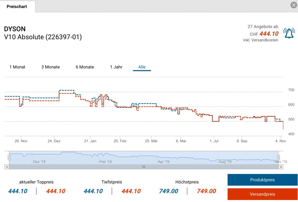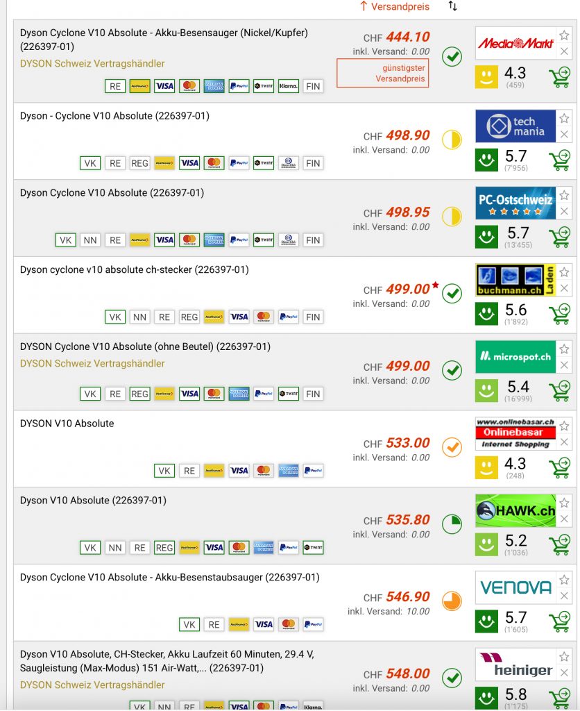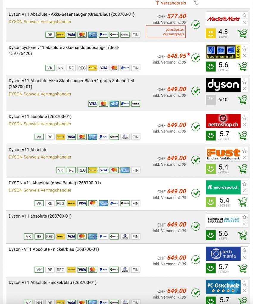 Bei MediaMarkt gibt es aktuell den DYSON V10 Absolute für 444.10 CHF. Zweitbester Preis sind gemäss toppreise 489.- CHF. Den V11 Absolute gibt es für 577.60 CHF. Zweitbester Preis gemäss toppreise sind 629.- CHF.