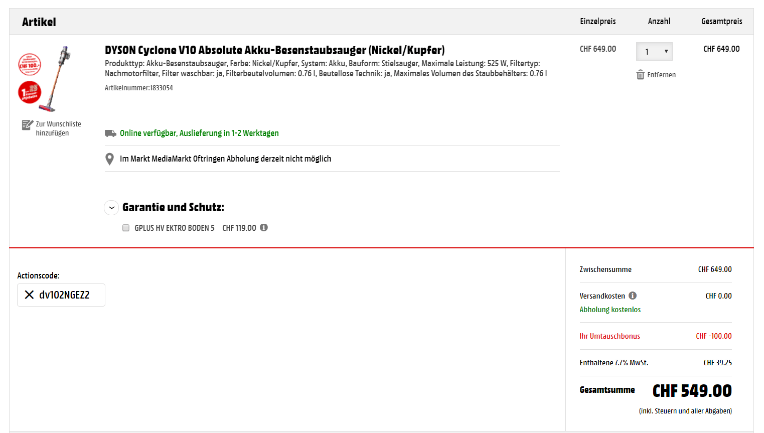Also einfach Email registrieren, Code erhalten und V10 für 549.- beziehen... ganz ohne Rückgabe eines alten Staubsaugers ;-)