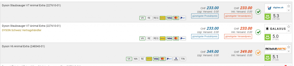 Bei digitec und dem Partner Galaxus gibt es den DYSON V7 Animal Extra Staubsauger für den Bestpreis von CHF 233.-. Der Preis war zuletzt vor ziemlich genau einem Jahr so tief. Der zweitbeste Preis beträgt CHF 349.-.