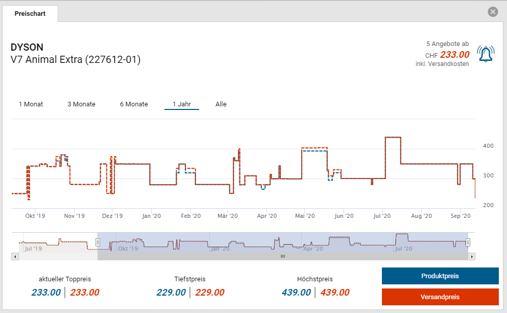 Bei digitec und dem Partner Galaxus gibt es den DYSON V7 Animal Extra Staubsauger für den Bestpreis von CHF 233.-. Der Preis war zuletzt vor ziemlich genau einem Jahr so tief. Der zweitbeste Preis beträgt CHF 349.-.