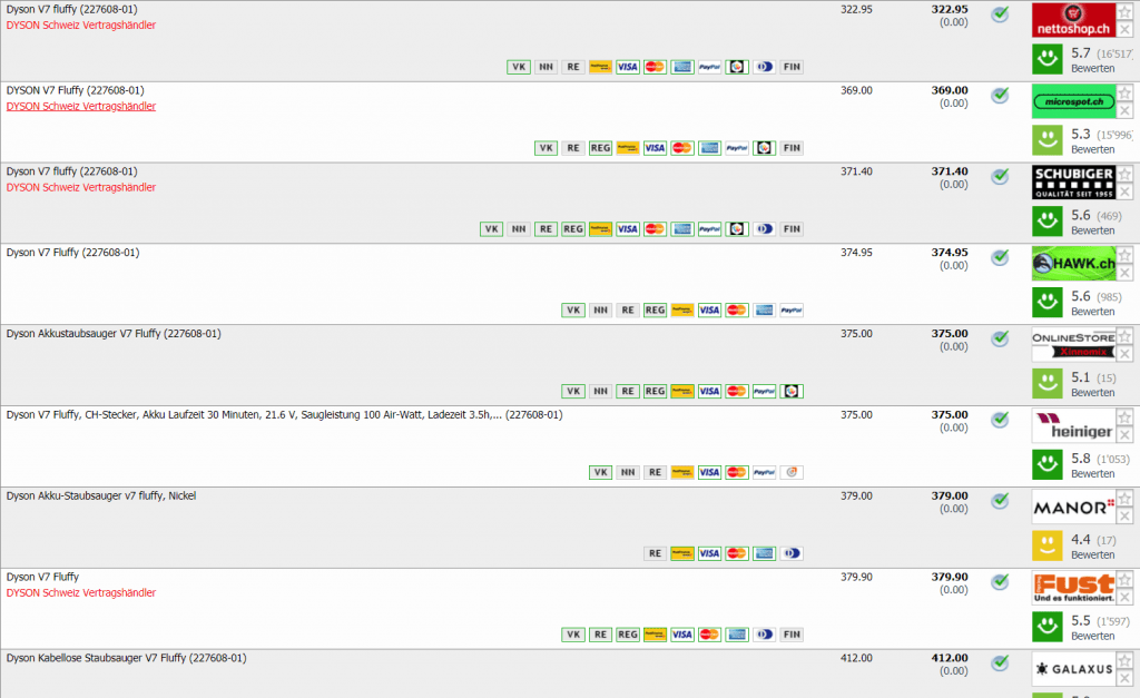 Neuer Bestpreis zum Dyson V7 Fluffy. Bei nettoshop nun für CHF 302.95 verfügbar, wenn man den Gutscheincode NETWP-20 verwendet. Damit ist der V7 Fluffy noch einmal 20.- günstiger als in der aktuellen 15% Aktion bei Interdiscount. Der drittbeste Preis in der Schweiz ist schon bei CHF 369.- Galaxus verlangt sogar über 400.- Bei melectronics ist der V7 Fluffy für unglaubliche CHF 549.- gelistet. Bisher lag der historische Bestpreis bei CHF 341.90.