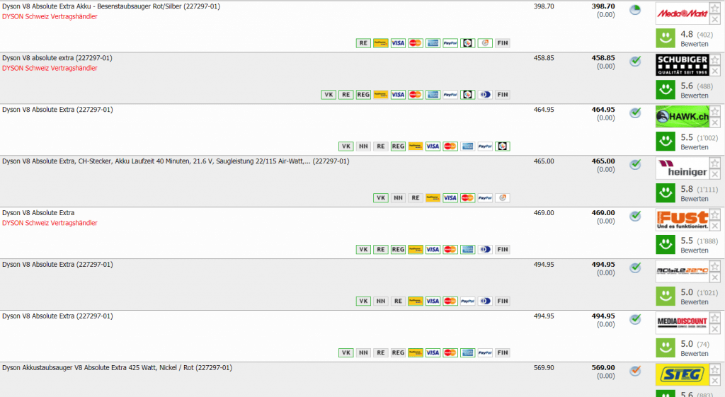 Bei nettoshop erhält man gerade den Dyson V8 absolute extra für CHF 379.- wenn man den Gutscheincode NETTO-20-GS beim Checkout eingibt. Zweitbester Preis in der Schweiz beträgt CHF 398.70, wobei die Preise anschliessend bis zu über 600 Franken ansteigen.