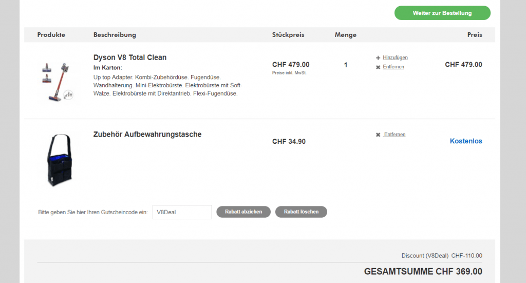 Im Dyson Shop gibt’s mit dem Gutscheincode V8Deal drei Modelle des kabellosen Staubsaugers Dyson V8 für CHF 369.- Zudem gibt’s ein gratis Zubehörteil (Auswahl zwischen “Zubehör Aufbewahrungstasche”, “Quick Release Verlängerungsschlauch” und “Quick Release Extra-hart Bürste”) obendrauf.