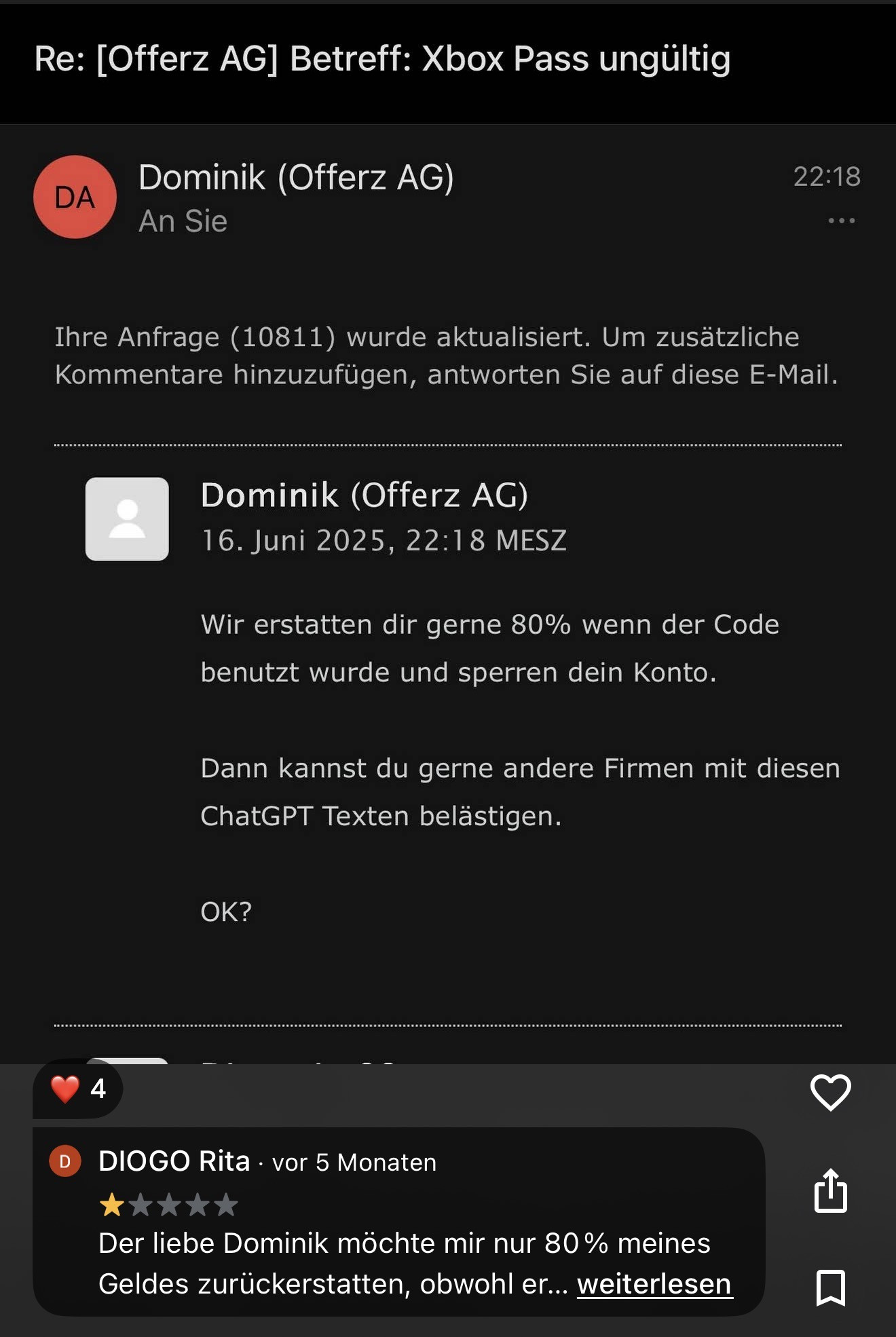 Gut… Die 1Stern bewertungen sind zum Teil auch Hausgemacht (von den Schreibenden). Klar kann man über den Ton von Dominik streiten, aber wenn ich dauernd solche Anfragen bekommen würde 🤮