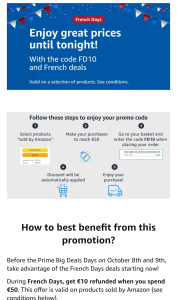 FD10, aber es ist nur auf ausgewählte Artikel von Amazon. Siehe auch: https://www.preispirat.ch/amazon-gutschein-fuer-10e-rabatt-ab-50e-bei-amazon-fr-2/