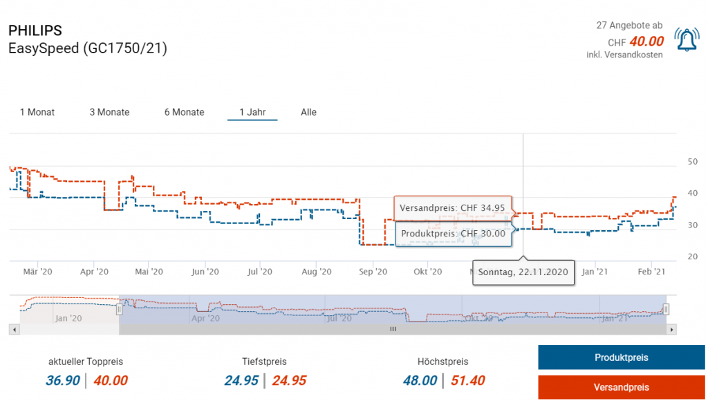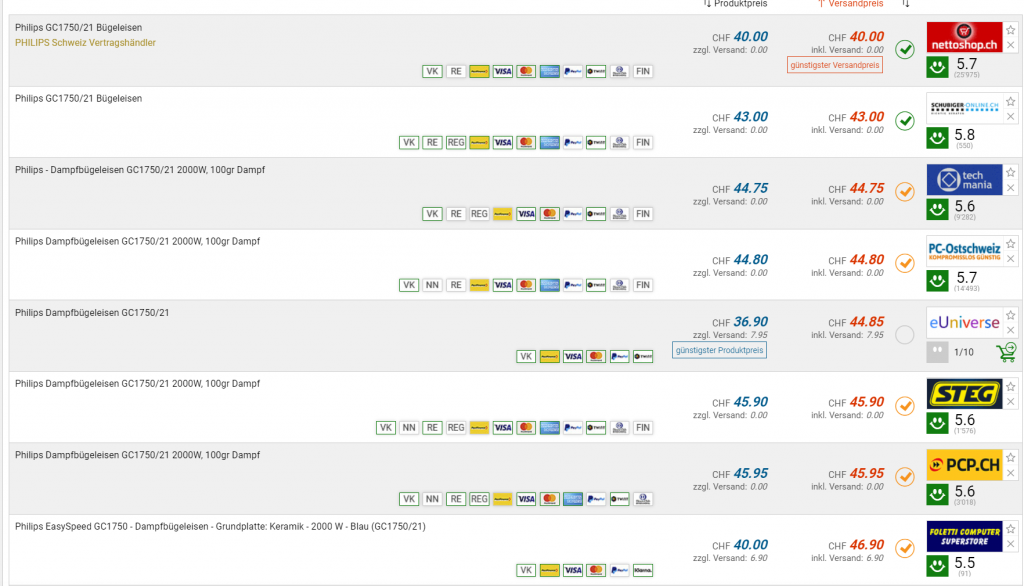 Bei Philips gibt’s noch einmal einen Hammer. Das EasySpeed Dampfbügeleisen GC1750/21 für gerade einmal 16 Franken inklusive Lieferung. Auf den Preis kommt man, wenn man das Bügeleisen für CHF 20.- in den Warenkorb legt und dann den Gutscheincode anwendet, den man für die Newsletter-Anmeldung erhält (gibt nochmals 20% Rabatt).