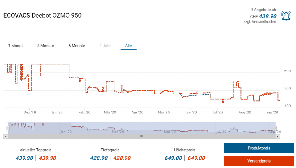 Bei Interdiscount gibts derzeit den Staubsaugerroboter von Ecovacs, dem Deebot Ozmo 950, zum neuen Bestpreis von CHF 424.90 mit dem Code „2020-TRADING“. Laut toppreise gabs den Roboter zuletzt am günstigsten Anfang Juli für knapp 429 Franken, derzeit kostet er beim zweitgünstigsten Anbieter aber 485 Franken.