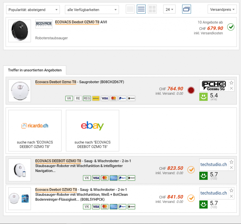 Das Set mit Absaugstation ist leider nicht in die Schweiz lieferbar. Der ECOVACS DEEBOT OZMO T8 AIVI gibts nun für 602. 45 CHF bei Microspot (2 Jahre Garantie) oder 612.- CHF bei Galaxus (5 Jahre Garantie)