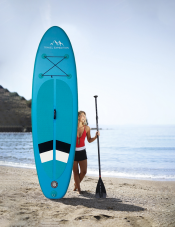 Das SUP mit 9 „Fuss“ ist aber nur 10cm Dick, dadurch hat es sehr wenig Volumen(169Liter) - kombiniert mit der instabilen einlagigen Bauweise, müsste es sich stark durchbiegen im stehen.