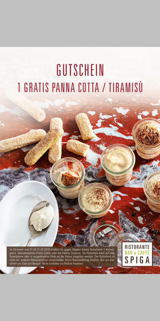 In diesem Monat gibts pünktlich mit dem neuen Newsletter wieder einen Gutschein fürs Spiga. Dieses Mal ists wieder das kleine Tiramisu / Panna Cotta, was wir schon im Herbst in diesem Deal hatten.