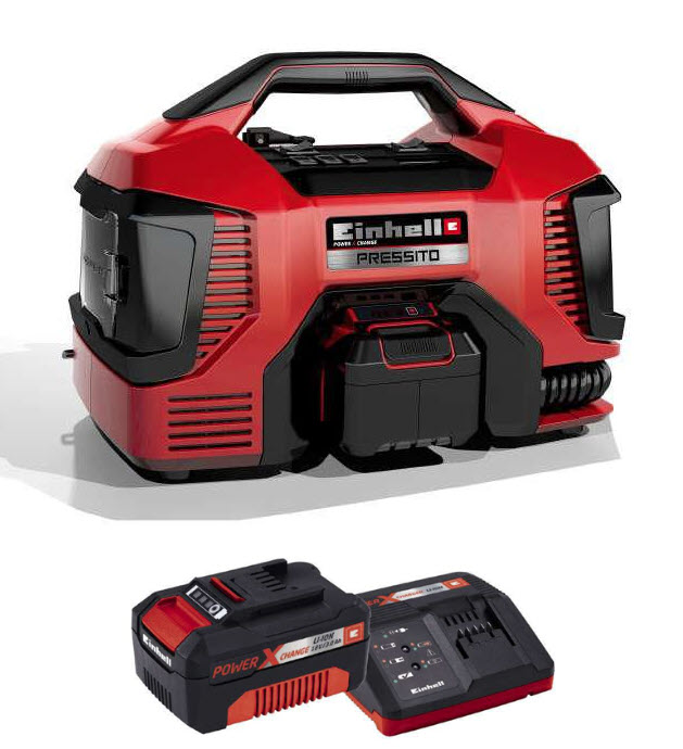 Der Einhell Hybrid Pressito ist ein mobiler Hybridkompressor zum Aufpumpen von Reifen und Bällen sowie zum Be- und Entlüften von Luftmatratzen. Der Betrieb erfolgt entweder über das Stromkabel oder einen 18-Volt-Akku (inklusive 3.0 Ah). Nebst Kompressor mit Akku und Ladegerät ist im Lieferumfang ein 3-teiliges Aufblas-Set mit Adaptern inklusive.