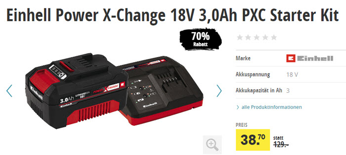 Momentan gibt es das Einhell Power X-Change 18V 3,0Ah PXC Starter Kit bei Coop Bau + Hobby zum Bestpreis von CHF 38.70 (nächstbester Preis bei Jumbo CHF 59.90). Bitte beachtet, dass es von den Starter Kits verschiedene Akkustärken gibt (1.5Ah, 2.0 Ah, 3.0 Ah und 4.0 Ah), welche sich natürlich preislich unterscheiden und bei einem Preisvergleich entsprechend berücksichtigt werden müssen. Wer übrigens noch andere Sachen einkauft und so auf einen Warenwert von mindestens CHF 50.- kommt, kann diesen zusätzlichen 15% Rabattbon ausdrucken und im Laden beim Kauf einlösen.