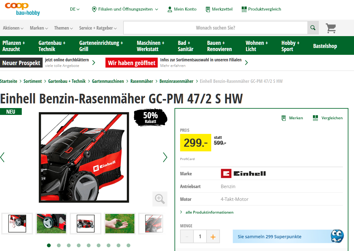 Im COOP Bau + Hobby gibt es aktuell den EINHELL Benzin Rasenmäher GC-PM 47/2 S HW zum Einführungspreis von CHF 299.00.