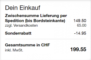 Leider kommen noch CHF 65.- Versandkosten dazu im Warenkorb. Siehe Screenshot: