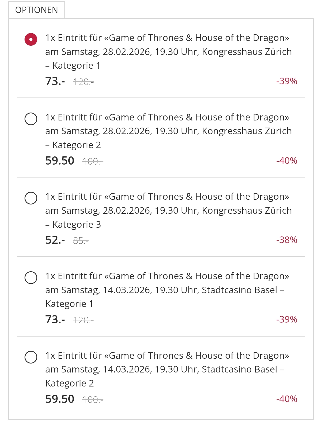 Eintritte für Konzert «Game of Thrones & House of the Dragon» bis 40% reduziert