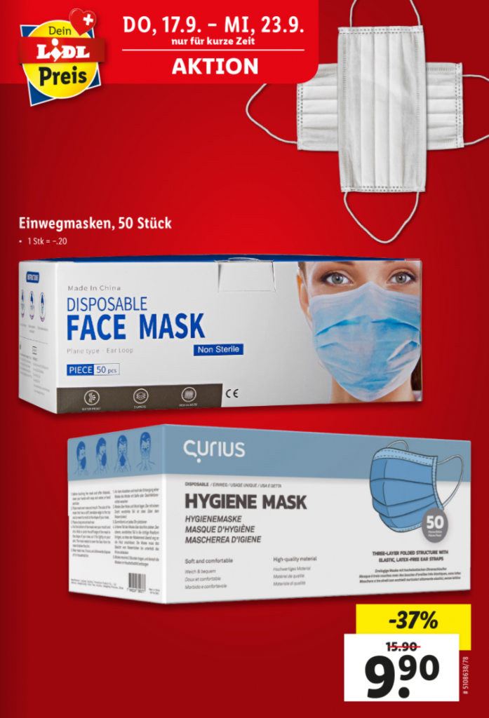 Ciao Muelli Ich habe die „Disposable Face Mask“ gekauft bei Lidl und bin sehr zufrieden. Finde diese besser als manch andere Hygienemasken.