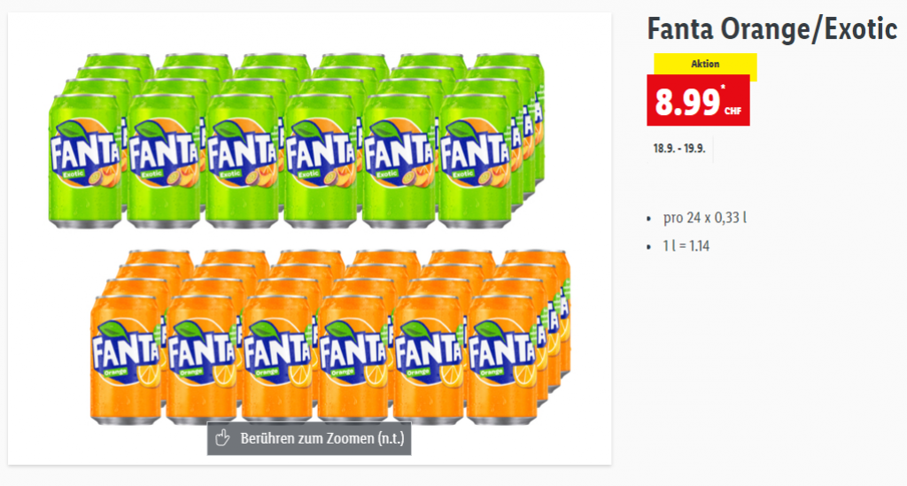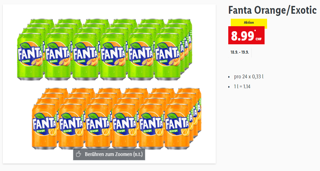 Weiter interessant z.B Fantadosen im 24-er Pack für 37 Rappen pro Dose (nur Freitag und Samstag)