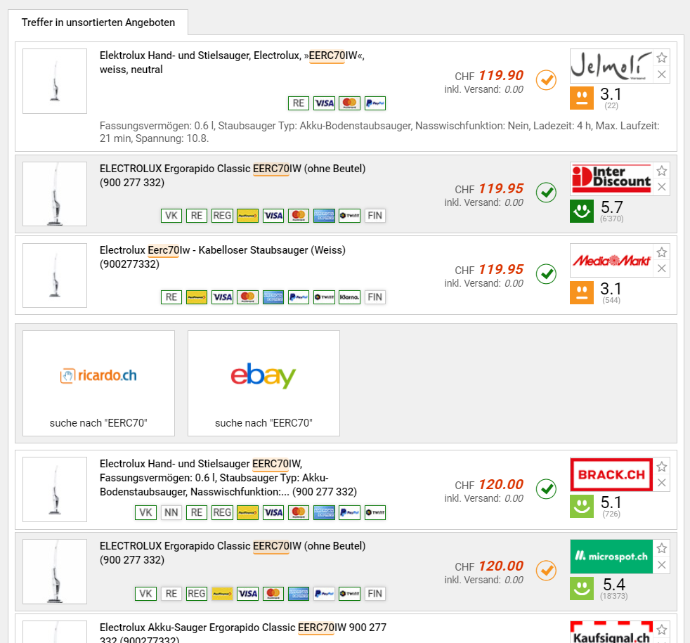 Laut toppreise sind die nächstgünstigeren Angebote für dieses Modell CHF 119.90 bei Interdiscount.