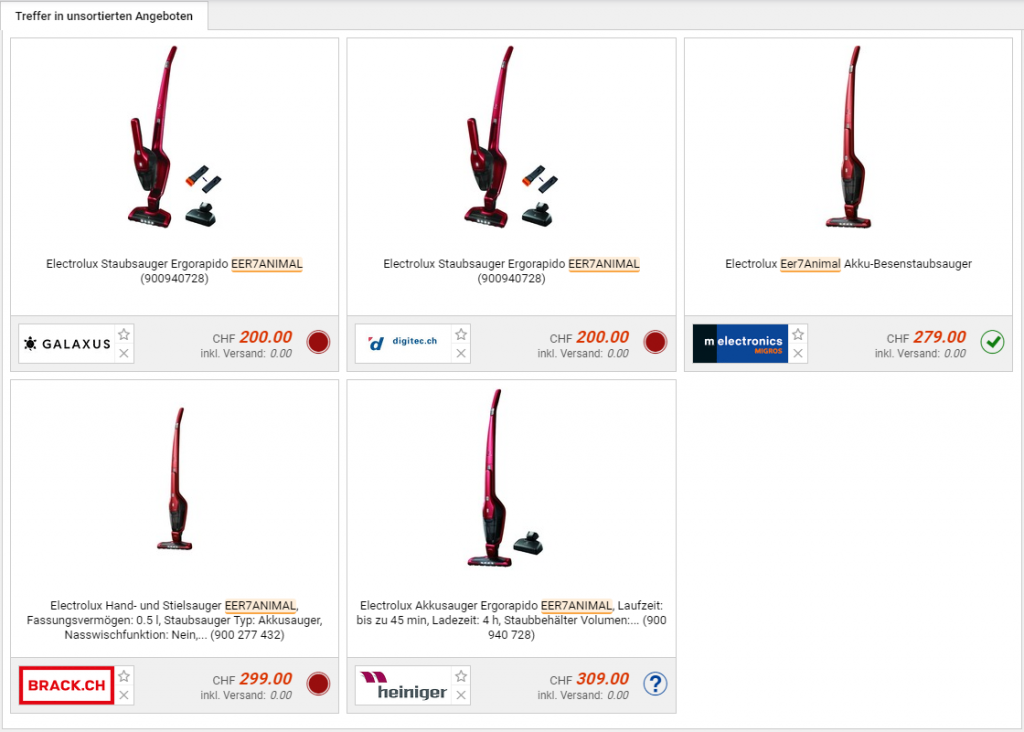 Bei nettoshop und Amazon gibts derzeit den Akkustaubsauger Ergorapido EER7ANIMAL von Electrolux zum Preis von etwa 180 Franken. Um bei nettoshop auf den Dealpreis zu kommen müsst ihr den Warenkorb auf mind. 200 Franken auffüllen (z.B. mit diesem Filter für 1 Franken) und den bekannten 20 Franken Bon anwenden. Bei Amazon liegt der Preis ohne Gutschein in der Region. Bei digitec wäre es zwar bestellbar allerdings nicht lieferbar, melectronics ist demnach der nächstgünstigere Anbieter mit 279 Franken.